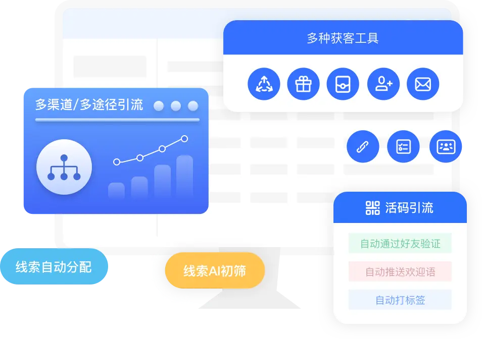 支持通过活码等方式获取线索,可自动标注线索来源,自动添加微信/企微,根据渠道来源发送欢迎语