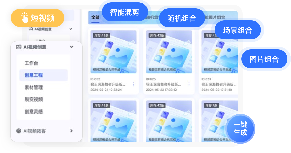 提供多种混剪模式,只需上传相应的素材及文案,即可批量产出不重复的视频