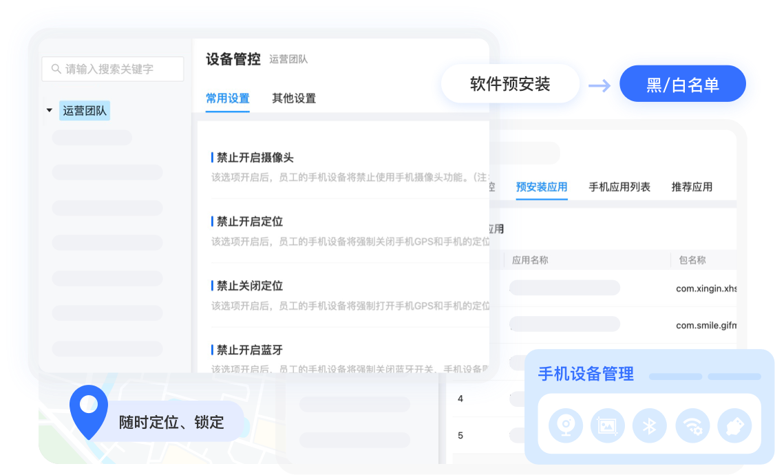 可禁止摄像头、截屏,蓝牙、移动网络、存储卡、恢复出厂设置、WIFI等设置及操作