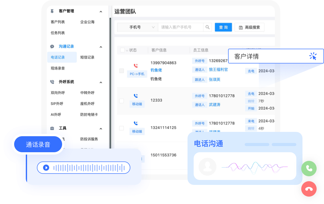 所有电话都将自动录音,并上传云端保存,管理者可随时复听沟通内容