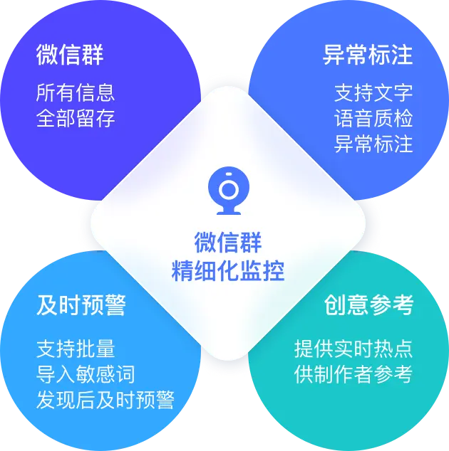 系统实时监测微信群中的敏感词,智能质检文字、语音,一旦触发立即预警
