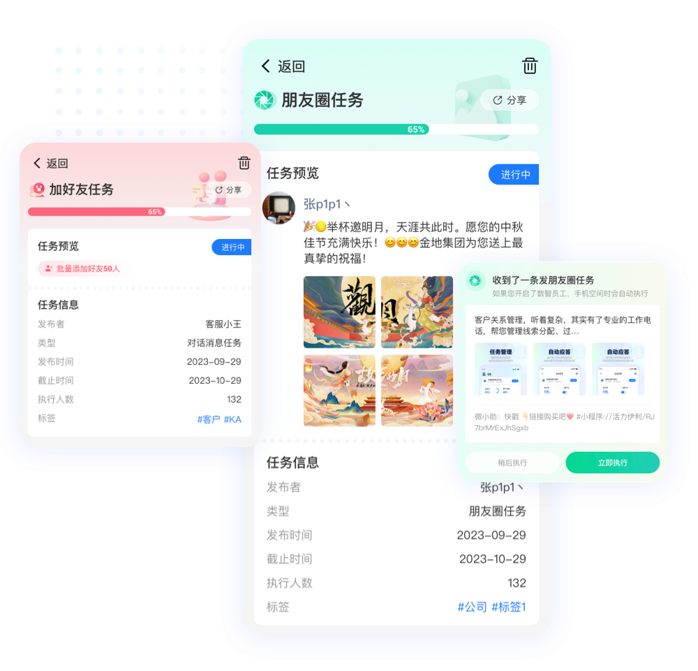 可统一下发群发消息、发朋友圈等任务给到员工执行