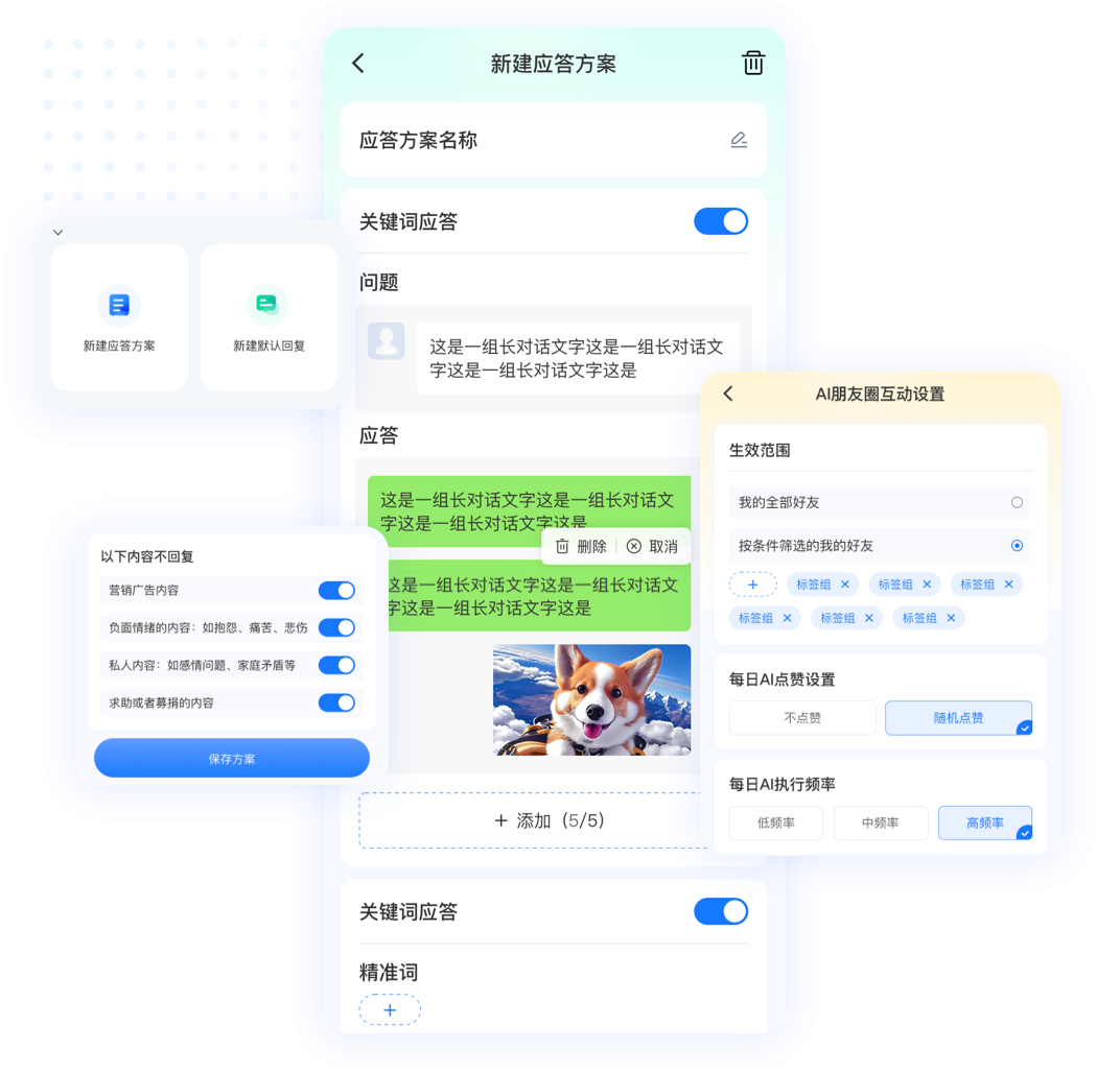 可自动回复客户问题,根据不同场景,设置基于关键词、FAQ等
