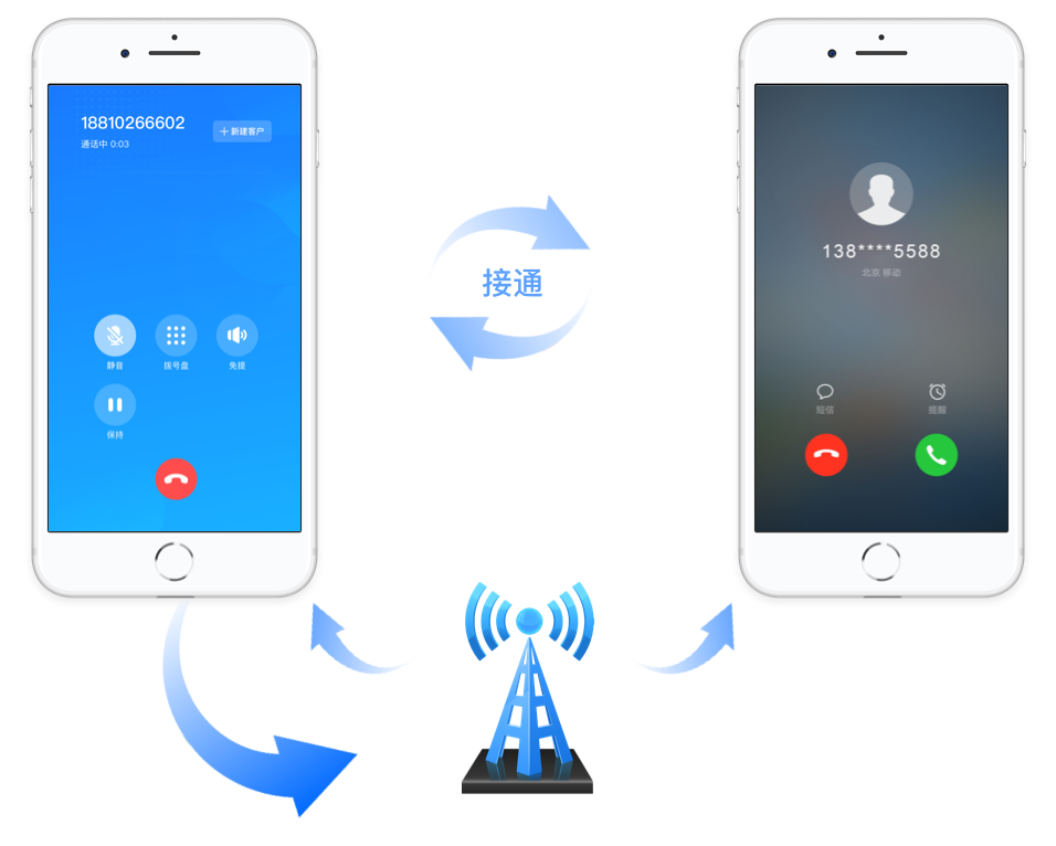 主叫号码被系统代替,系统依次向主叫号码、被叫号码发起呼叫,双方应答后建立通话。